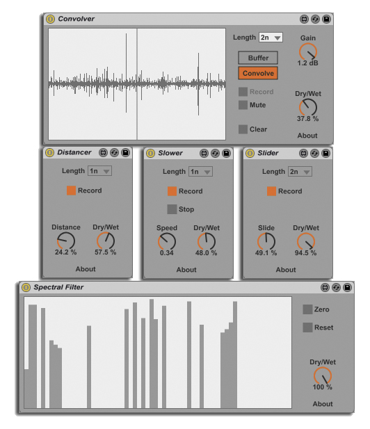 M4L Bulbs includes five plugins: + Convolver + Distancer + Slower + Slider + Spectral Filter